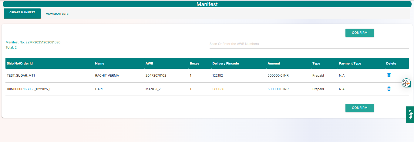Step 6: Review the complete list of shipments you’d like to include in the manifest, then click Confirm.