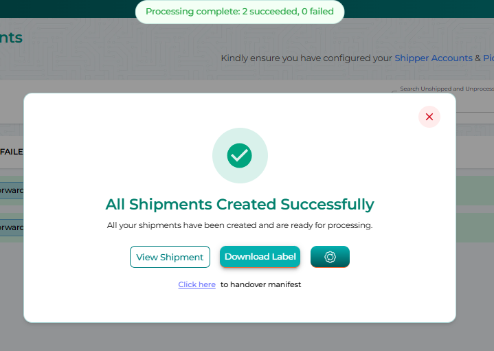 Step 7: The shipment will be created successfully, and a confirmation message will be displayed.