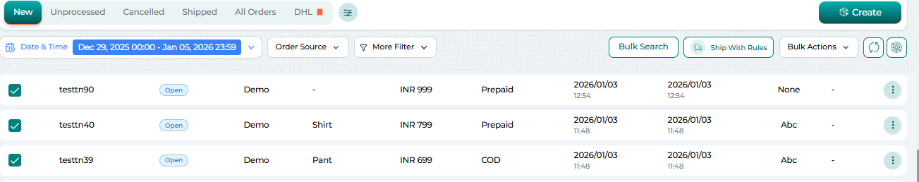 Step 1: Log in to your eShipz account. Step 2: Navigate to Fulfillment and click on Orders. Step 3: Click on the three dots corresponding to the order you wish to process and select Create Shipment. Step 4: Click on the Fetch Now button. Step 5: ...