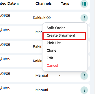 Step 3: Click on the three dots corresponding to the order you wish to process and select Create Shipment.