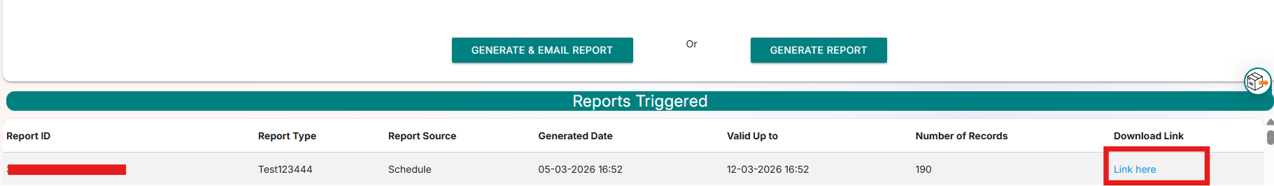 - A download link will be generated on the same page, along with the timestamp of when the report was generated.