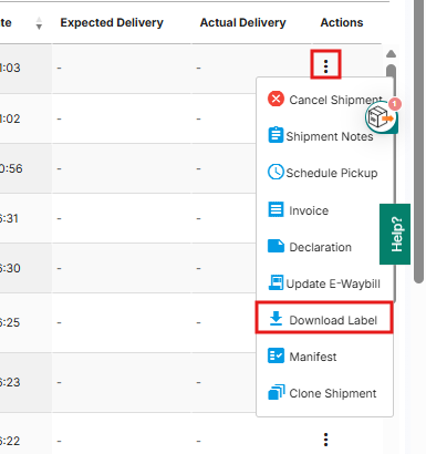 Step 3: Click on the three dots (action menu) corresponding to the shipment for which you want to download the label, and select Download Label.