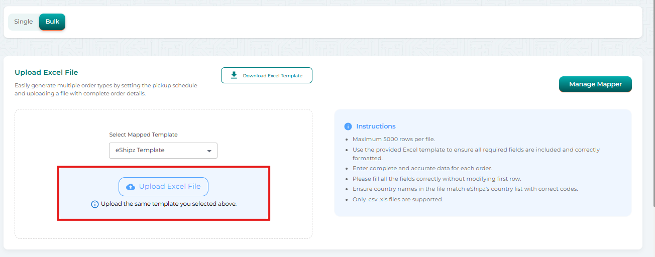 eShipz allows you to upload your own Excel file format for shipment processing. To ensure successful data import, you need to map your Excel columns to the required fields defined by eShipz. Step 1: Hover over Excel Upload-> Click Shipments/Orders ...