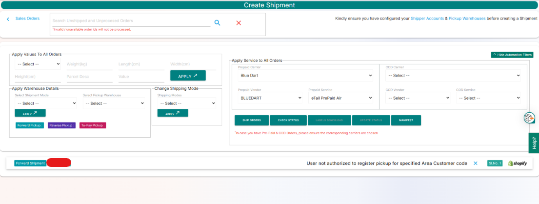 how to handle the error - “User not authorized to register pickup for specified Area Customer code” for bluedart carrier?