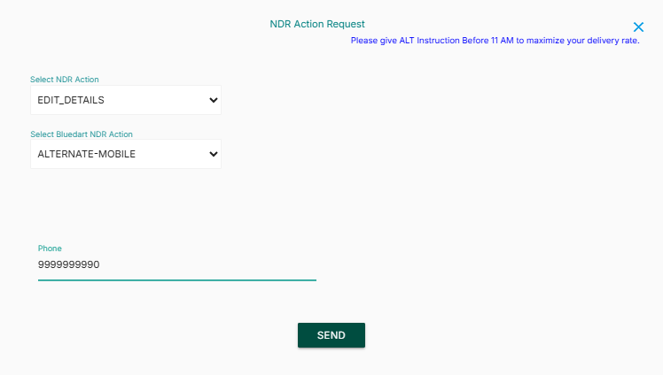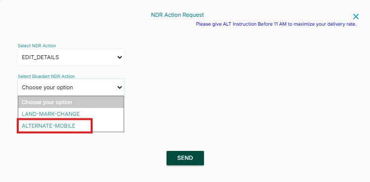 - To update the customer contact number, click on “ALTERNATE-MOBILE” and enter the new number and click on send.
