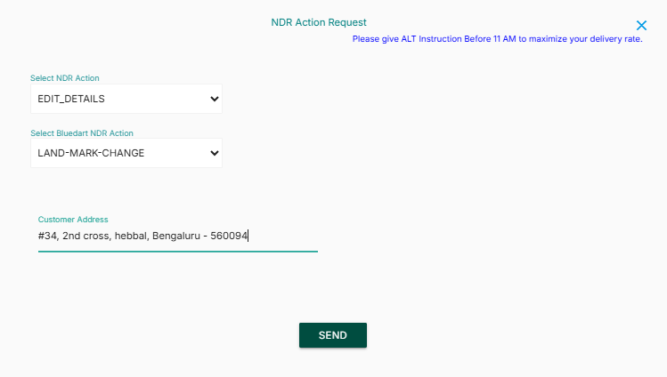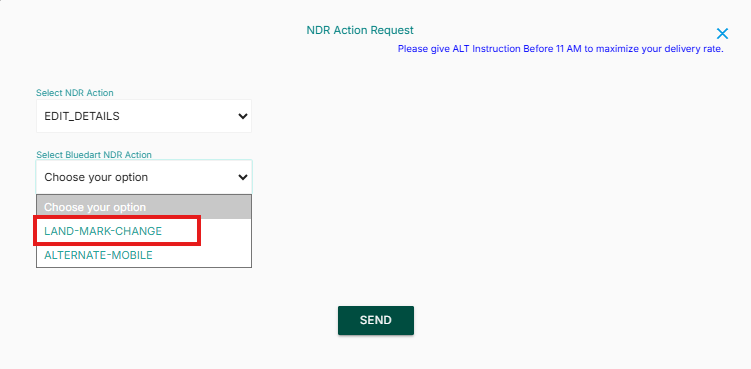 - To update the customer address, click on “LAND-MARK-CHANGE” and enter the new address details and click on send.