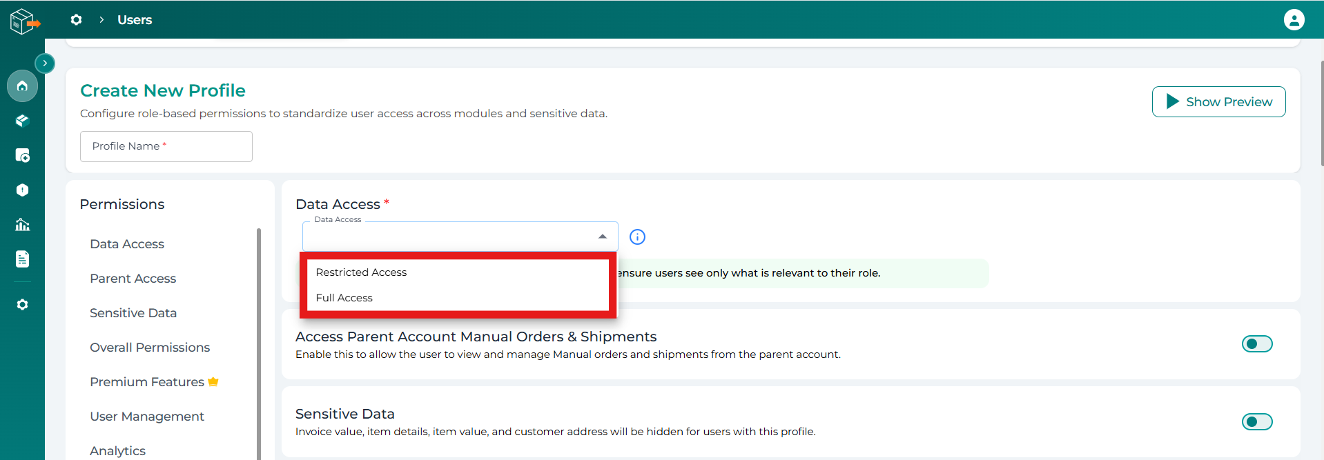 While creating a profile, you can define the level of data access: