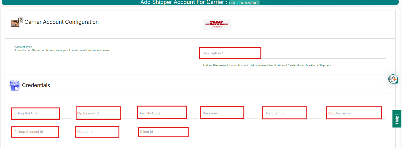 Step 6: Enter all the required details: Description, Billing ref number, Ftp password, Facility code, Password, Merchant Id, Ftp username, Pickup account Id, Username, Client Id.