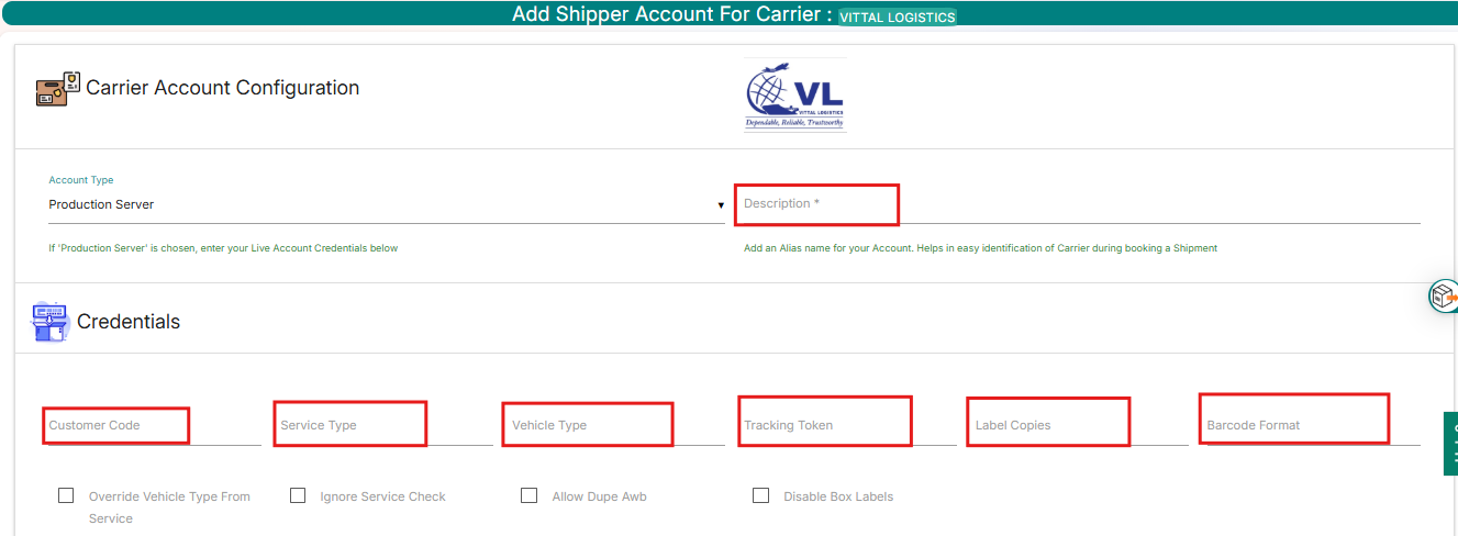 Step 6: Enter all the required details: Description, Customer code, Service type, Vehicle type, Tracking token, Label copies, Barcode format .