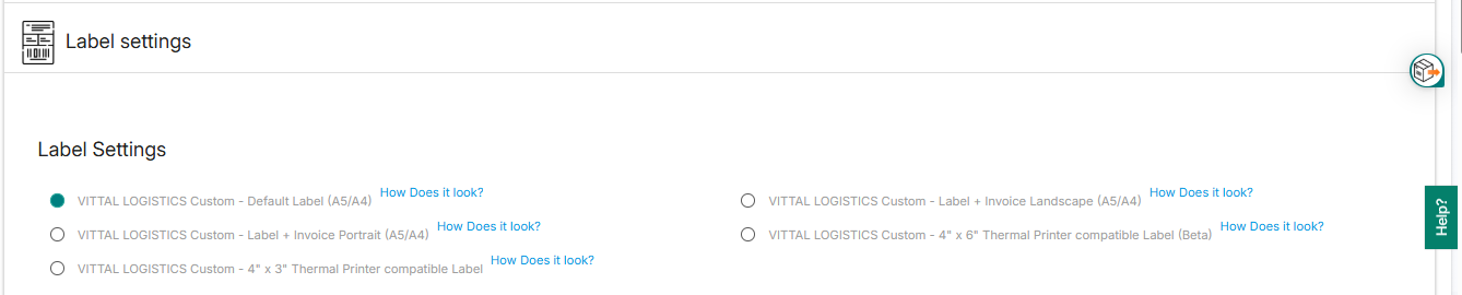 Step 7: Label Settings: In Label Settings there are several label formats mentioned, sample templates for the same can be viewed by clicking on ‘How Does it look?’,which is present just beside the format name. Based on the format of label required, choose the options under Label Settings. If none of the options is selected then the default label will be generated in VITTAL LOGISTICS Custom-Default Label (A5/A4)format after shipment creation.